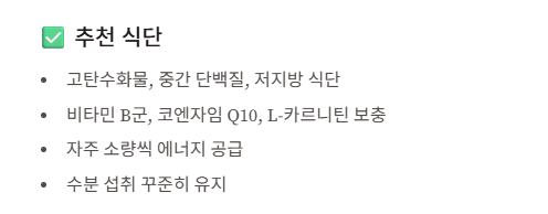 - 비타민 B군, 코엔자임 Q10, L-카르니틴 보충