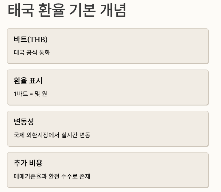 태국의 공식 통화는 '바트(THB)'입니다. 한국 원화(KRW)와의 환율은 "1바트 = 몇 원"으로 표시되며, 이 환율은 국제 외환시장에서 실시간으로 변동합니다.