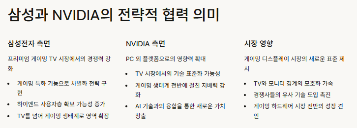 "AI 기술과 게임 퍼포먼스를 겸비한 제품으로 최고의 엔터테인먼트 경험을 제공하겠다"는 삼성전자 부사장의 발언은 NVIDIA와의 기술적 시너지를 예고하는 발언으로 해석될 수 있습니다.