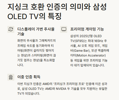 이 글에서는 삼성 OLED TV의 지싱크 인증 의미, NVIDIA와의 관계, 그리고 주가에 어떤 영향을 줄 수 있는지 다각도로 분석해보겠습니다.