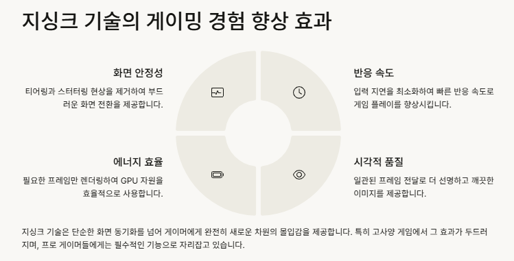 지싱크 호환은 고사양 PC 게이머에게 필수 기능으로, 몰입감 있는 게임 환경을 제공합니다.