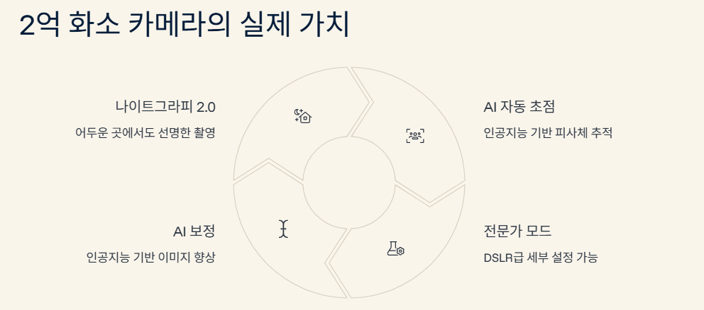 2억 화소라고 하면 숫자만 커 보이지만, 실제로는 AI 기반 사진 보정 기능과 연동돼 진짜 결과물의 차이를 만들어냅니다.
