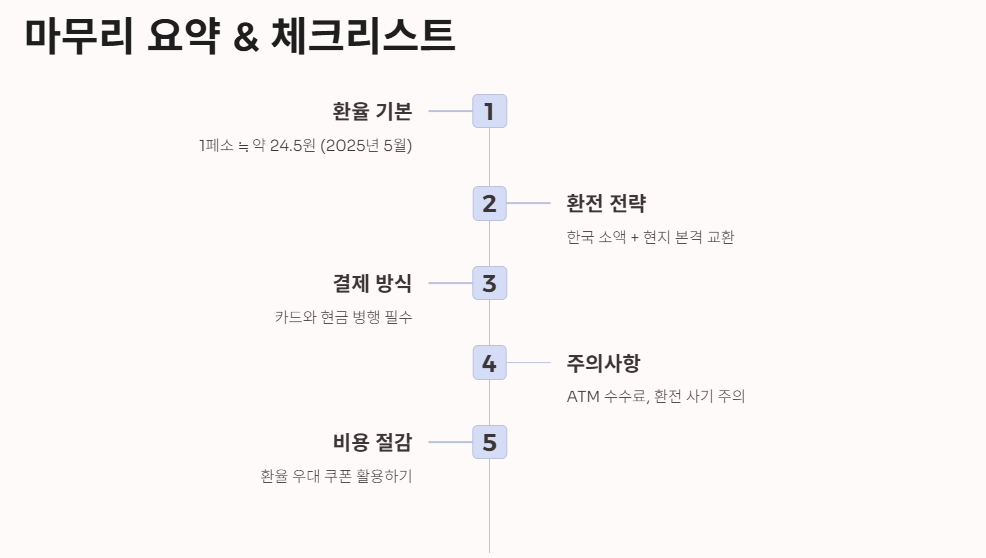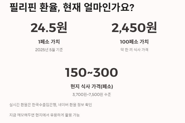 - 필리핀 환율은 1페소 ≒ 약 24.5원 (2025년 5월 기준)